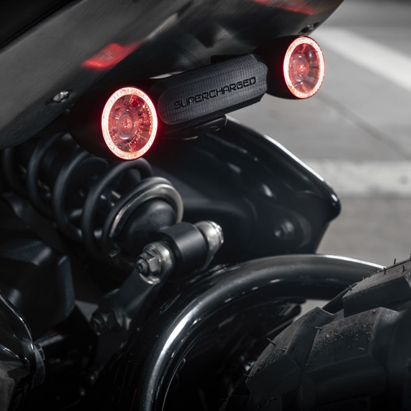 This boosted bobber makes 110whp and 88ft/lb of torque. The centrifugal supercharger has a smooth power delivery allowing this bike to be super predictable on and off-road.